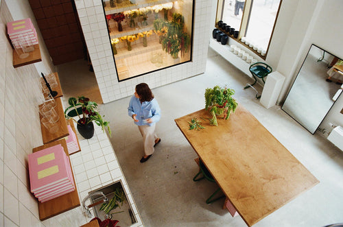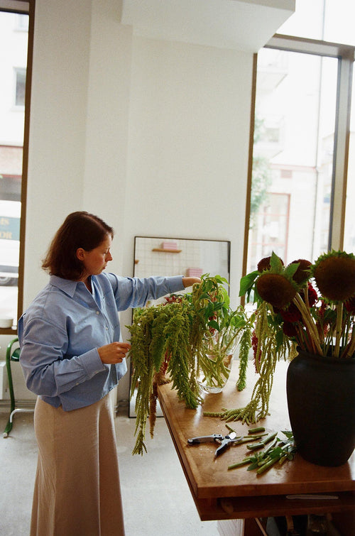A studio design that shifts with the season. Liza Langen opened her purpose-built flower shop and studio just a year ago, during fall of 2024, but it has already been through many iterations of looks. The custom-designed interior hasn’t changed, but still the look of the space shifts as the contents of visually dominant custom flower fridge changes with the seasons. We visited Liza for a chat while she was working on a floral arrangement to be styled with our fall 2025 collection.