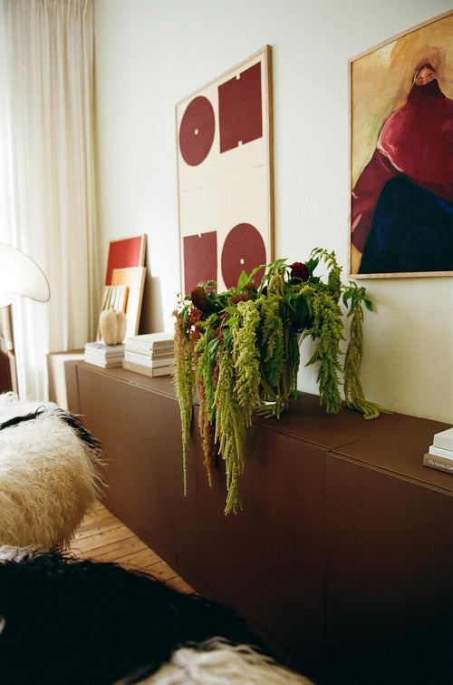 Below: Floral arrangement by Liza Langén with the fall 2025 collection in the WOA apartment.