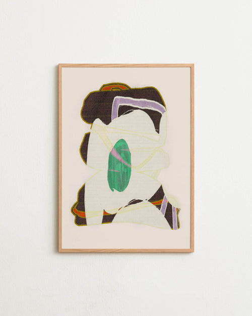 Art print with an abstract artwork featuring soft, overlapping shapes and a grainy texture. Earthy tones meet light fields and are framed by a distinct green core. Styled in a minimalist interior.