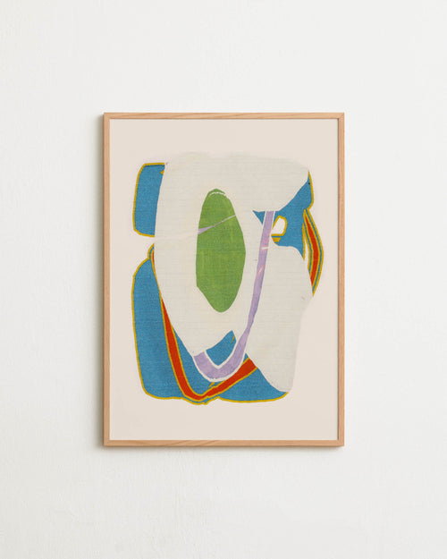 Art print with an abstract artwork featuring soft, overlapping shapes and a grainy texture. Blue tones meet light fields and are framed by a distinct green core. Styled in a minimalist interior.