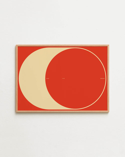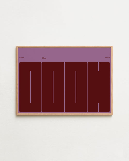 Framed artwork with red text on a beige background Three abstract artworks with geometric patterns on a wall.