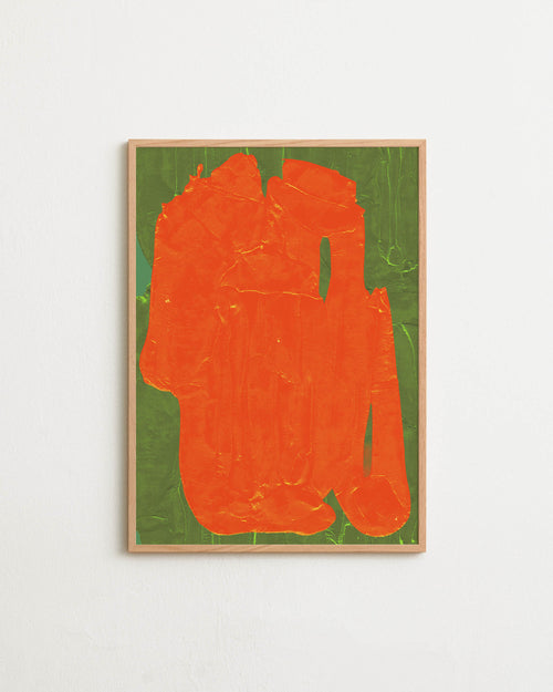 Art print featuring soft, blurred, and flowing bright orange shapes emerging against a dark green surface, creating an impression of motion and impermanence. Styled in a minimalist interior.