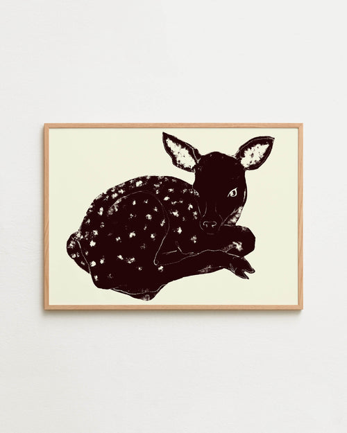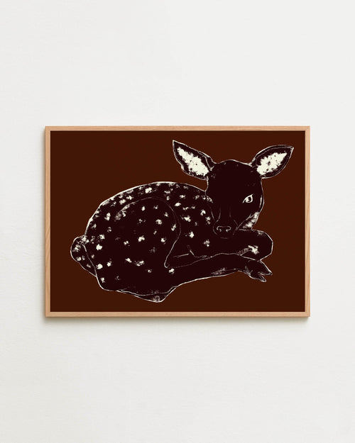 Art print with a stylized illustration of a lying deer in a dark tone against a bright red background, with a minimalist and graphic expression. Styled in a minimalist interior.