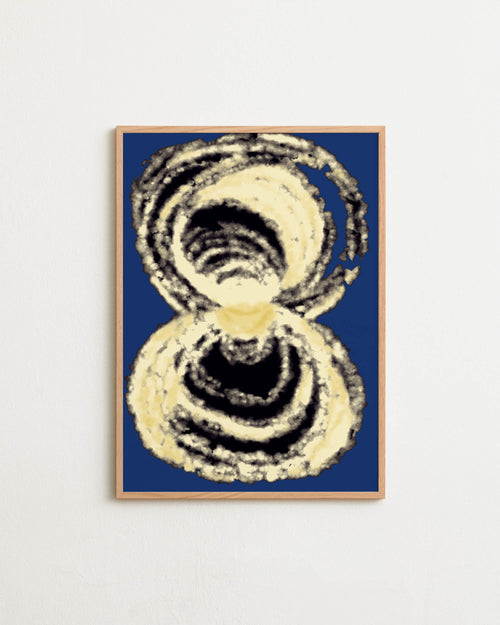 Art print with an abstract illustration of circular forms in light tones against a cobalt blue background, with a soft and organic expression. Styled in a minimalist interior.