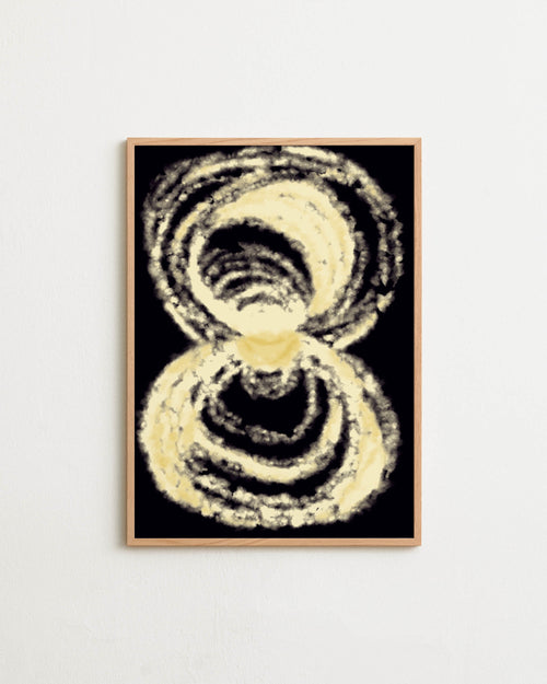 Art print with an abstract illustration of circular forms in light tones against a dark background, with a soft and organic expression. Styled in a minimalist interior.