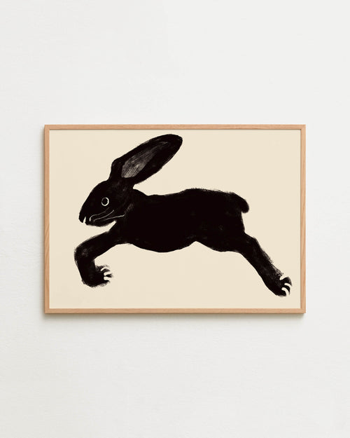 Art print with a stylized illustration of a hare in a dark tone against an off-white background, with a minimalist and graphic expression. Styled in a minimalist interior.