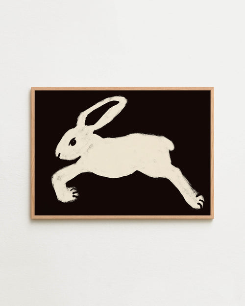 Art print with a stylized illustration of a hare in a light tone against a black background, with a minimalist and graphic expression. Styled in a minimalist interior.