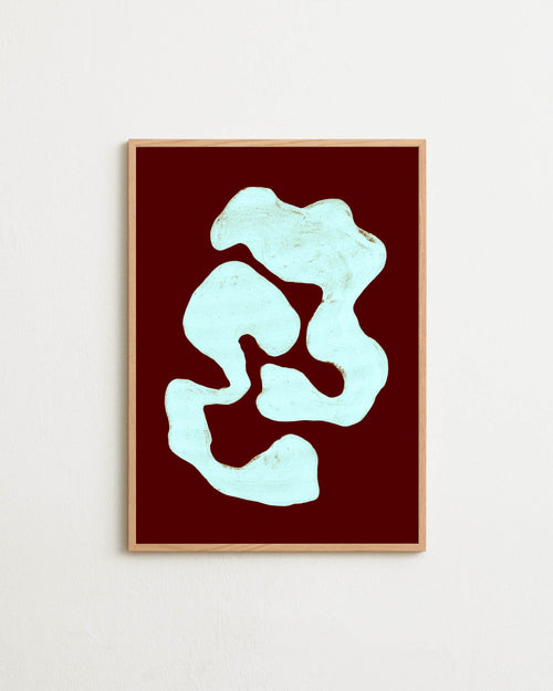 Art print featuring two analogue-themed components wrapping around one another in ice blue against a burgundy background. Styled in a minimalist interior.