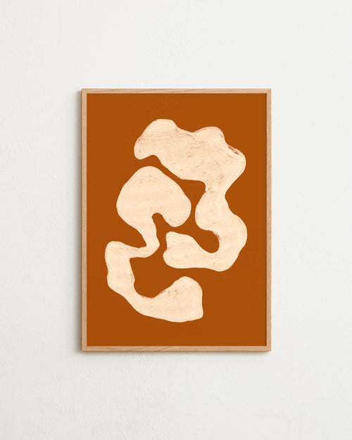 Art print featuring layered and sweeping brushstrokes in two shades of brown that create a sense of movement and tension across the surface. Styled in a minimalist interior.