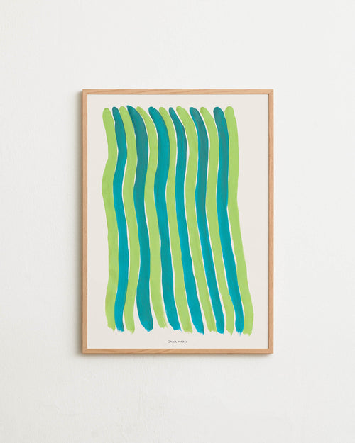 Framed turquoise striped print styled in a modern interior.