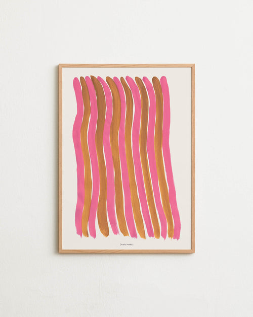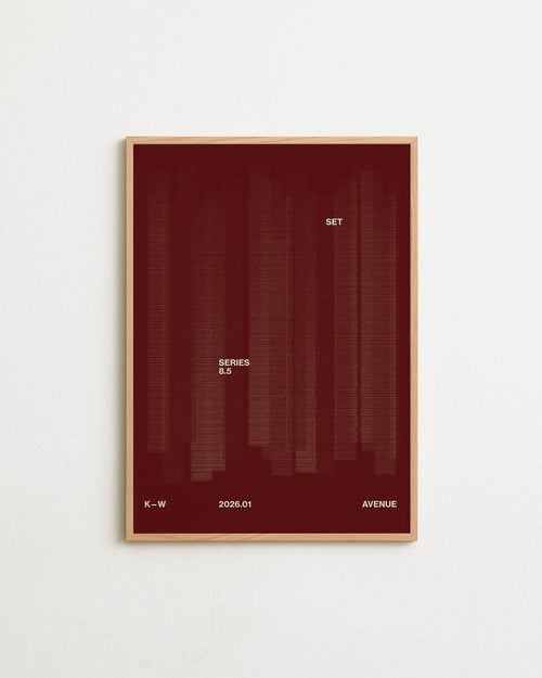 Art print with a graphic illustration of vertical fields built from dense lines, complemented by small text elements, in brown and red RAL colors. Styled in a minimalist interior.