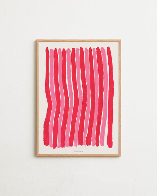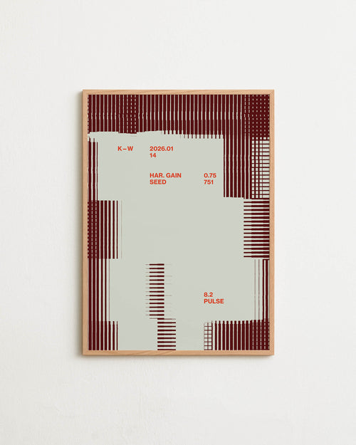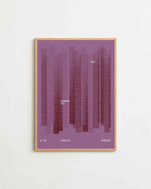 Art print with a graphic illustration of vertical fields built from dense lines, complemented by small text elements, in red and purple RAL colors. Styled in a minimalist interior.