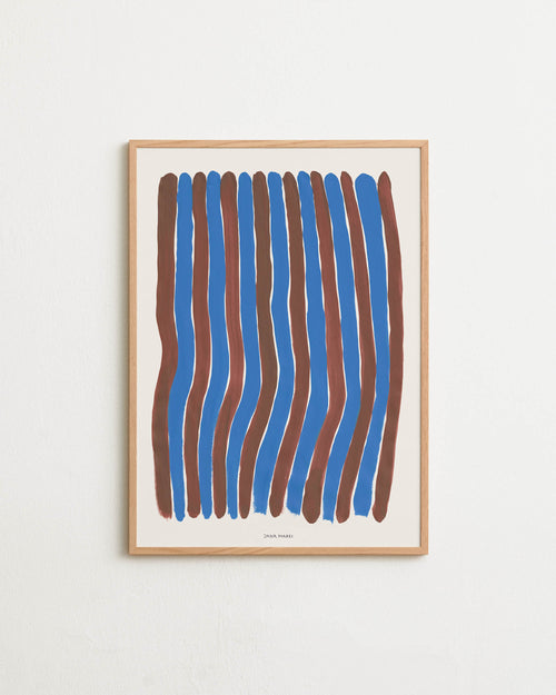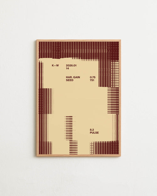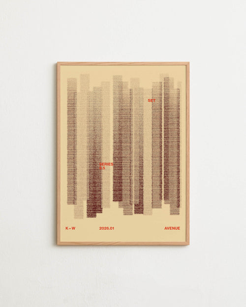 Art print with a graphic illustration of vertical fields built from dense lines, complemented by small text elements, in brown and beige RAL colors. Styled in a minimalist interior.
