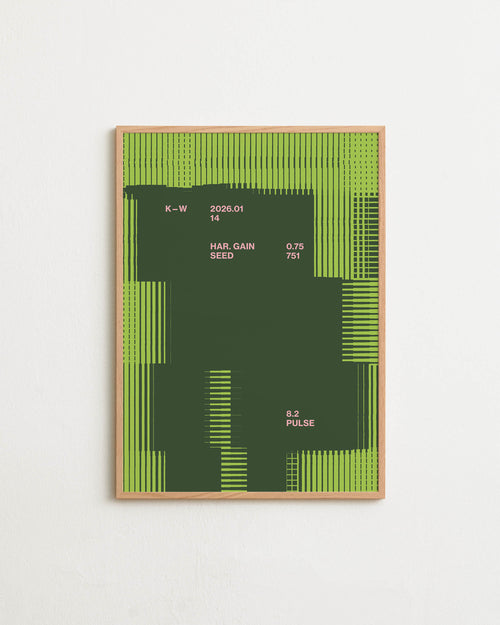 Art print with a graphic illustration of rectangular fields and linear patterns, combined with small text elements, in green and pink RAL colors. Styled in a minimalist interior.