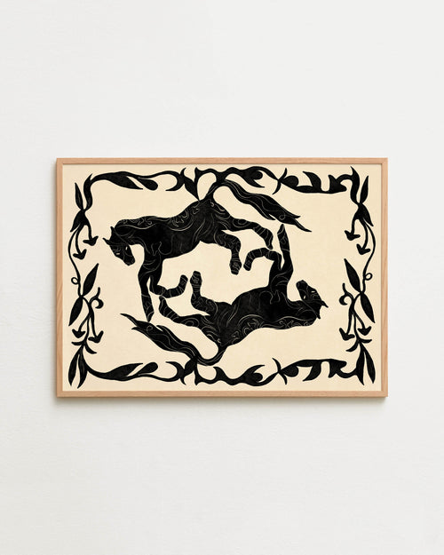 Art print with a minimalist illustration of black, organic, hand-drawn lines and silhouettes of horses against an off-white background. Styled in a minimalist interior.