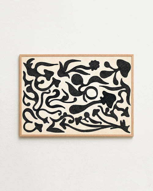 Art print with a minimalist illustration of black, organic, hand-drawn lines against an off-white background. Styled in a minimalist interior.
