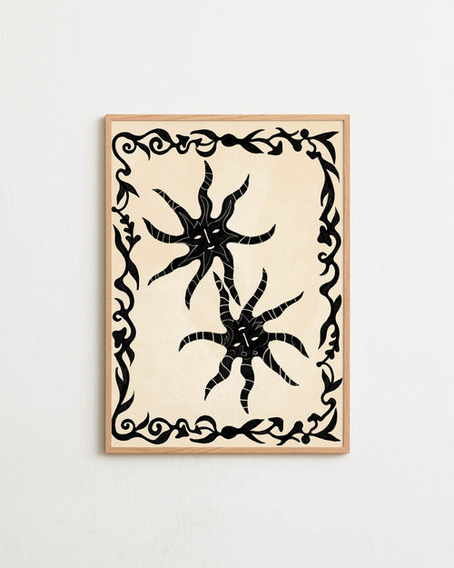 Art print with a minimalist illustration of black, organic, hand-drawn lines and suns against an off-white background. Styled in a minimalist interior.