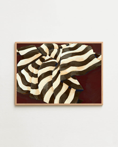 Art print featuring a painting of a plaid against a deep burgundy background, flowing with wide stripes in dark chocolate brown and creamy white. Styled in a minimalist interior.