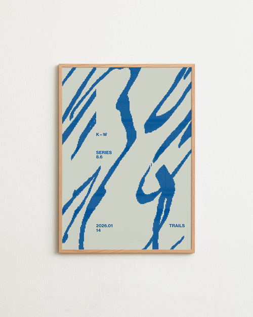 Art print with a graphic illustration of sweeping, organic forms built from dense lines, complemented by small text elements, in blue RAL colors. Styled in a minimalist interior.