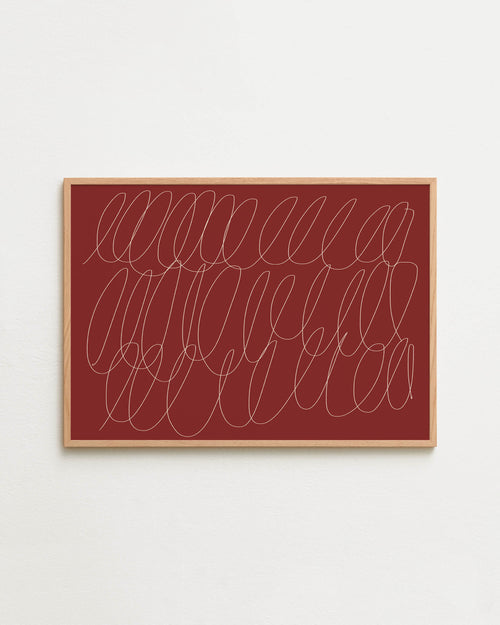 Art print with a graphic illustration of sweeping, continuous lines in a light tone against a red background, with a minimalist and abstract expression. Styled in a minimalist interior.