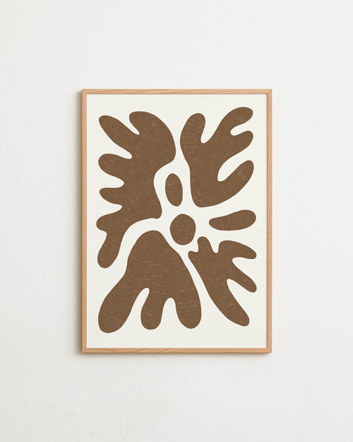 Art print featuring a minimalistic motif in warm brown and soft beige, with shapes that explore the space between abstraction and recognition through soft, fluid forms. Styled in a minimalist interior.