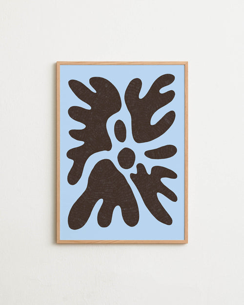 Art print featuring a minimalistic motif in chocolate brown and pastel blue, with shapes that explore the space between abstraction and recognition through soft, fluid forms. Styled in a minimalist interior.