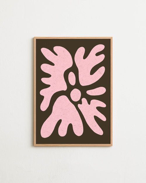 Art print featuring a minimalistic motif in chocolate brown and pastel pink, with shapes that explore the space between abstraction and recognition through soft, fluid forms. Styled in a minimalist interior.