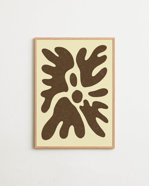Art print featuring a minimalistic motif in warm brown and soft yellow-beige, with shapes that explore the space between abstraction and recognition through soft, fluid forms. Styled in a minimalist interior.