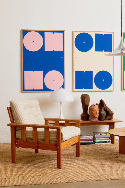 Modern living room with wooden armchair, colorful abstract art, and decorative items.